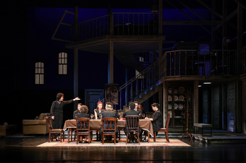 一座三層美式木質小樓靜立于舞臺中央,灰白冷調、高聳的閣樓,共同營造出壓抑的氛圍,與劇中“牢籠”的核心意象緊密呼應。雖是實景呈現,舞美設計申奧卻未拘泥于現實主義手法,而是以立體而寫意的筆觸,將這座小樓如透視圖般展開于觀眾眼前。一層作為主表演區,以陳舊家具搭建出客廳、餐廳等真實生活場景。實體的門,成為家庭成員聚散離合的象征——他們由此歸家,亦由此帶著傷痛離去,同時它也是連接屋內與屋外的接口。二層與三層則摒棄了真實的墻壁與窗戶,代之以粗細不一的木構線條,勾勒出屋頂與欄桿的輪廓。這一通透的處理,不僅拓展了視覺層次,也為表演提供了更多空間可能。隨著轉臺緩緩轉動,小樓的每個角落皆可成為表演區域,與左側的書房、右側的花園共同構建出流動的敘事場景。