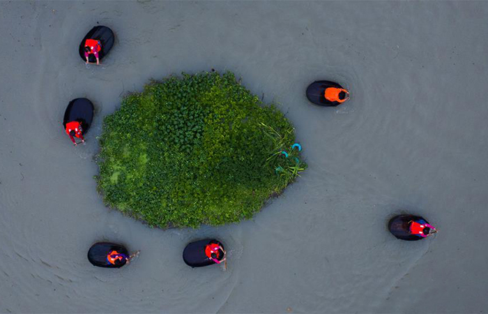 村民們劃著菱桶在水面上你追我趕,同時采收荷花和蓮蓬,呈現出水鄉特有的端午節日氛圍。