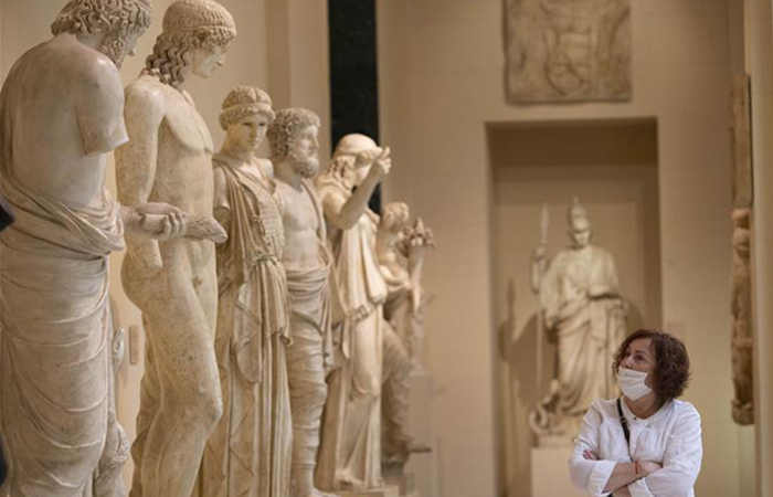 7月10日,一名女子在俄羅斯首都莫斯科的普希金造型藝術博物館內參觀。當日,受疫情影響關閉的普希金造型藝術博物館恢復向公眾開放。
