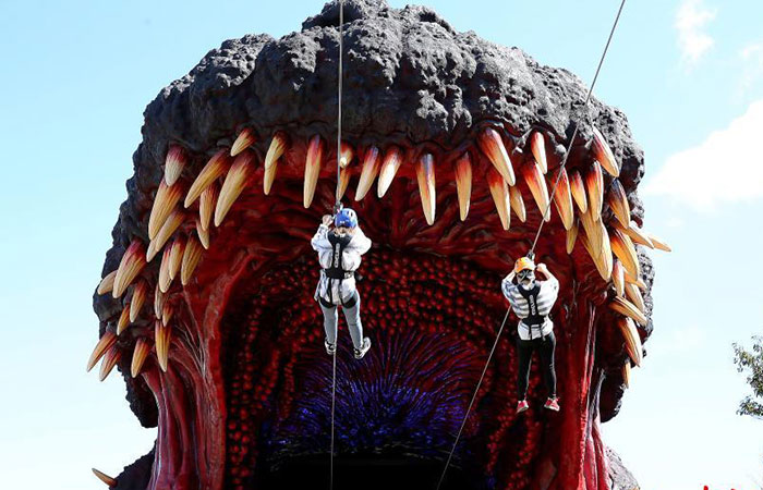 “二次元之森”體驗型主題公園推出等比例哥斯拉游樂設施,游客可以通過吊威亞進入哥斯拉的“血盆大口”,以“迎擊”哥斯拉。