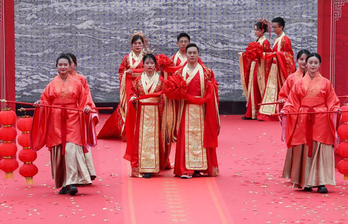 2020(庚子)年傳統婚禮儀式在貴陽市孔學堂舉辦,新人身穿中式婚服,通過合巹禮、解纓結發、共書婚帖等方式完成了傳統婚禮儀式。